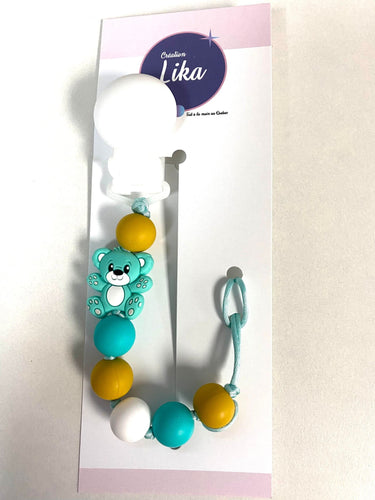 Attache suce ourson turquoise/moutarde