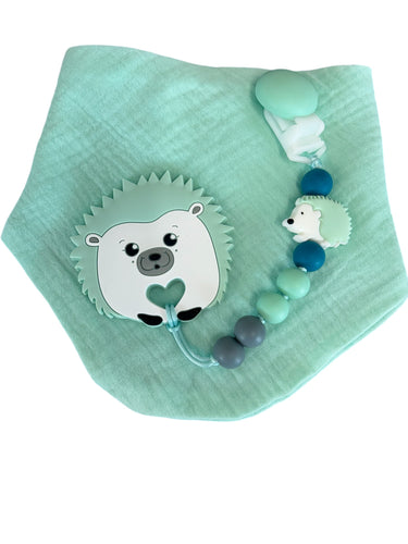 Kit bavoir, attache suce et jouet de dentition hérisson menthe