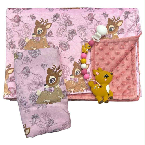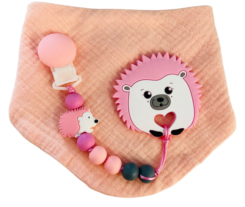 Kit bavoir, attache suce et jouet de dentition hérisson rose