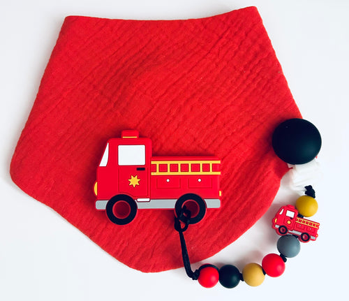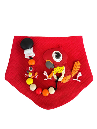 Kit bavoir, attache suce et jouet de dentition perroquet rouge